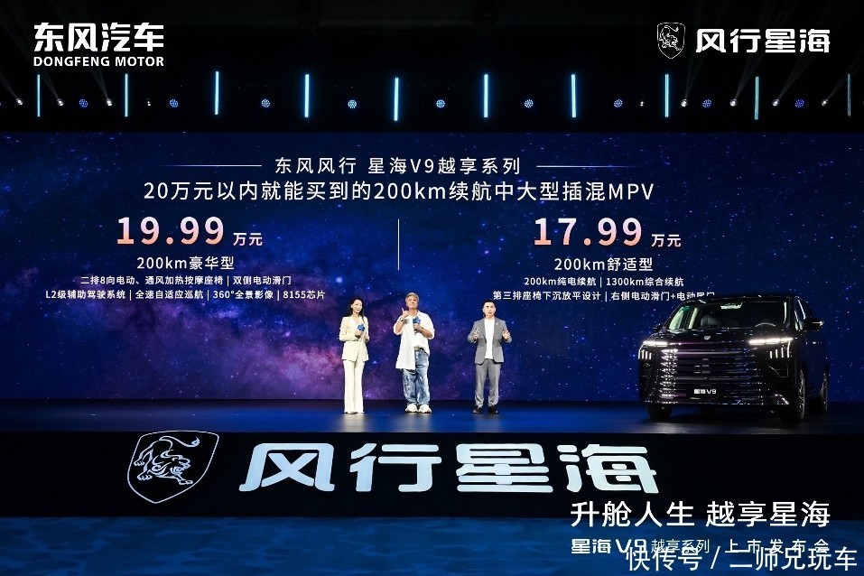 2025年8月21日,20万内唯一中大型插混MPV——东风风行星海V9越享系列正式上市。新车共分舒适型/豪华型两个版型,官方指导价分别为17.99/19.99万元场内配资,国补央补后低至14.99/16.99万元起。凭借续航、空间、舒适、安全、品质五大升舱,东风风行星海V9越享系列以燃油车的价格,为用户带来高端新能源车的豪华体验,标志着“20万内新能源豪华MPV时代”正式到来。