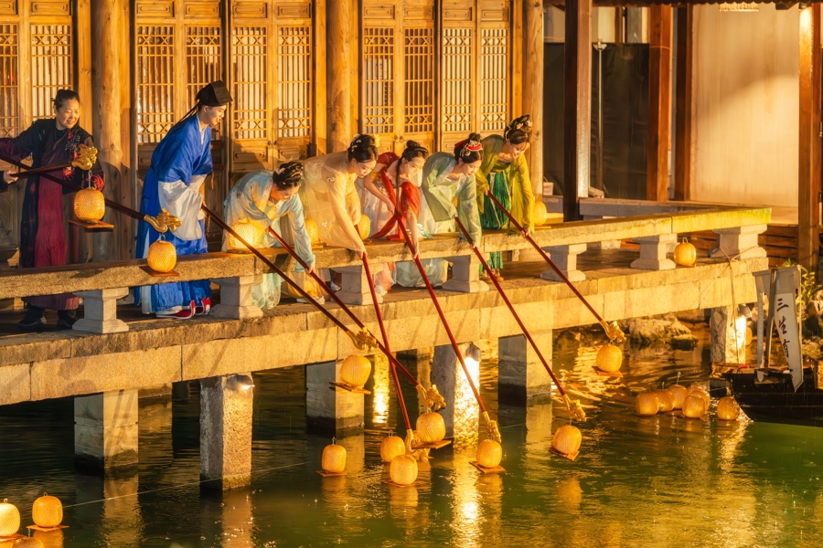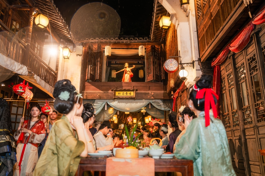 换上汉服、沉浸式做一天古人,疏解现实压力。今秋,濮院时尚古镇以沉浸式宋文化体验为核心,将古镇的寺湾街转化为一座“不宵禁”的宋代繁华梦境。4大沉浸式场景、近百名NPC助阵,百余种特色体验、60分钟超长沉浸夜秀……暮色四合,寺湾街千灯齐亮,游客可持“交子”畅游夜市、赏灯宴饮,品尝宋式茶点、体验非遗手作。或在繁华之处与 “牙行濮老爷”谈买卖,看“杂耍郎”跑江湖,甚至在随机掉落的剧情任务中,成为这出“千年一梦”的一部分,真正复刻《东京梦华录》中“夜市直至三更尽,才五更又复开张,耍闹去处,通宵不绝”的场景。